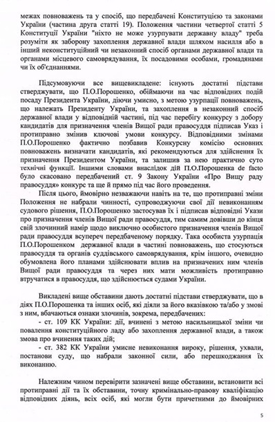 Юрист прикрепил к сообщению шесть страниц поданной жалобы, где указывается, что Порошенко незаконно назначил двух членов Высшего совета правосудия по президентской квоте.