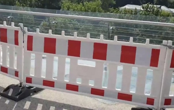 Стеклянные панели нового пешеходного моста ограждены от пешеходов забором. Об этом 30 мая сообщил журналист Игорь Рец. Он опубликовал видео с моста.