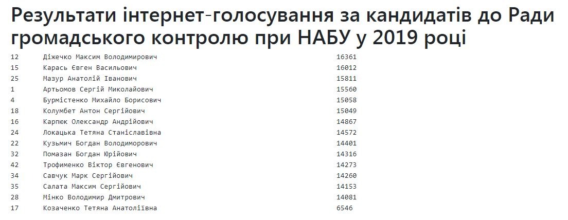 Совет общественного контроля НАБУ формируется в составе 15 человек, набравших наибольшее количество голосов по результатам онлайн-голосования.