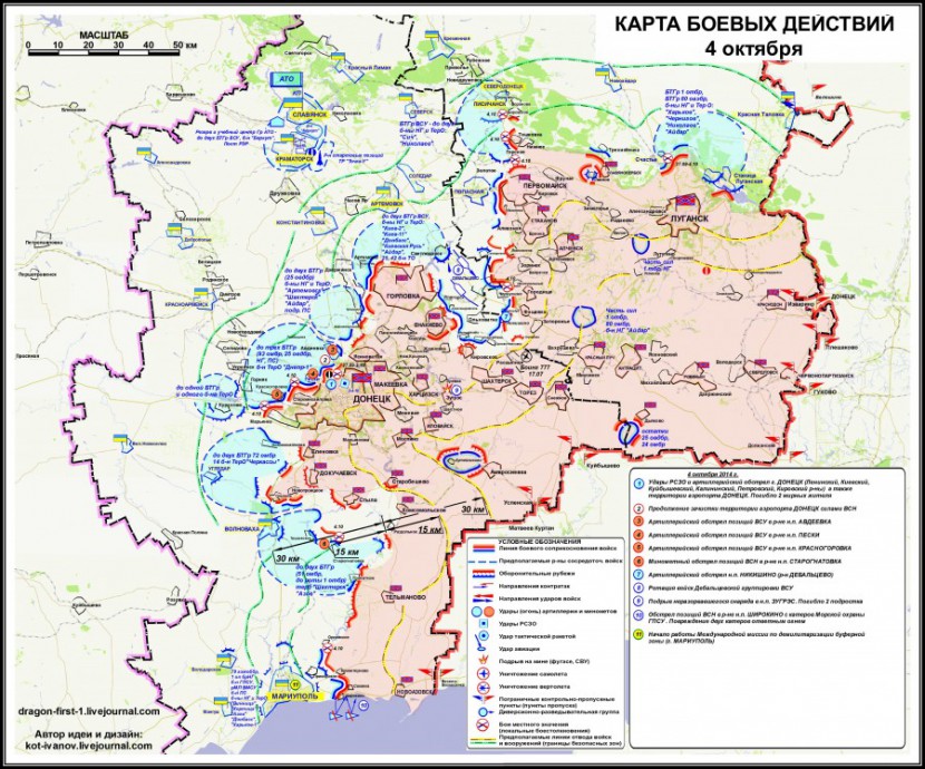 В свою очередь артиллерия Новороссии отработала по позициям ВСУ около Донецка – в район н.п. Красногорка, а также пыталась подавить огневые точки ВСУ в районе Авдеевки и н.п. Пески. По сообщениям некоторых ополченцев 4 октября по позициям украинской армии в районе аэропорта ополчение ДНР впервые применяло САУ «Гиацинт» (полученные накануне от ополчения ЛНР).