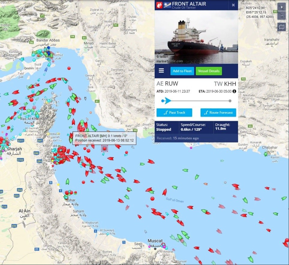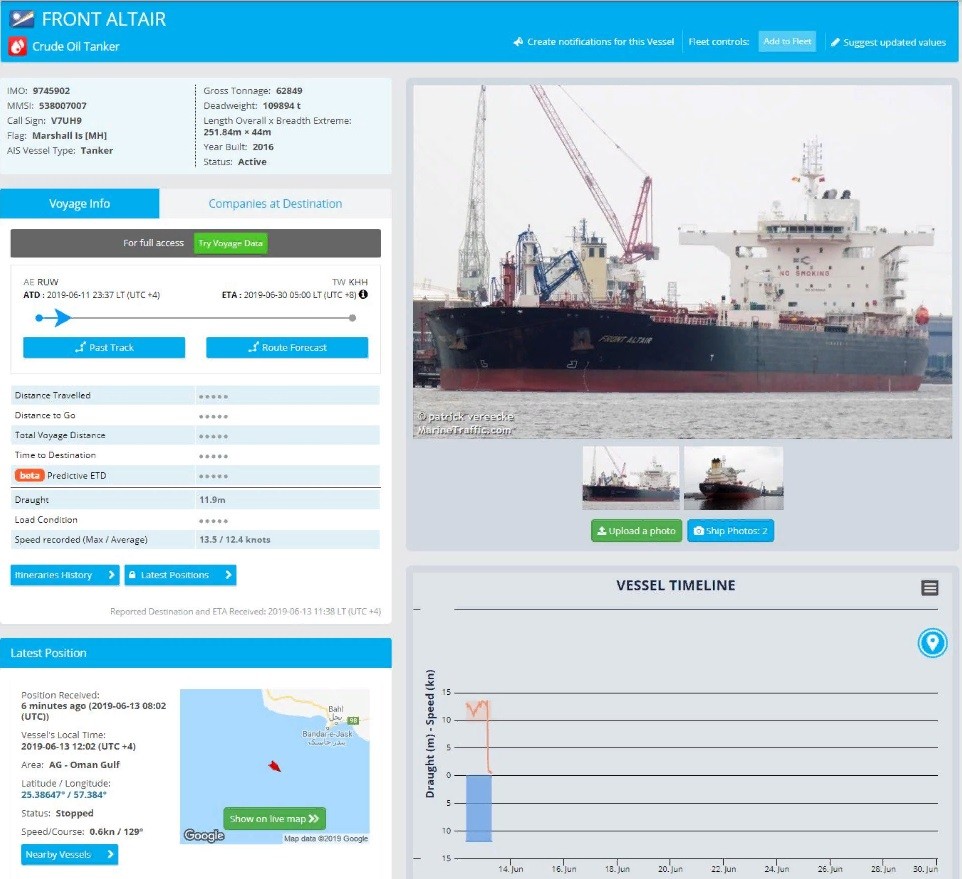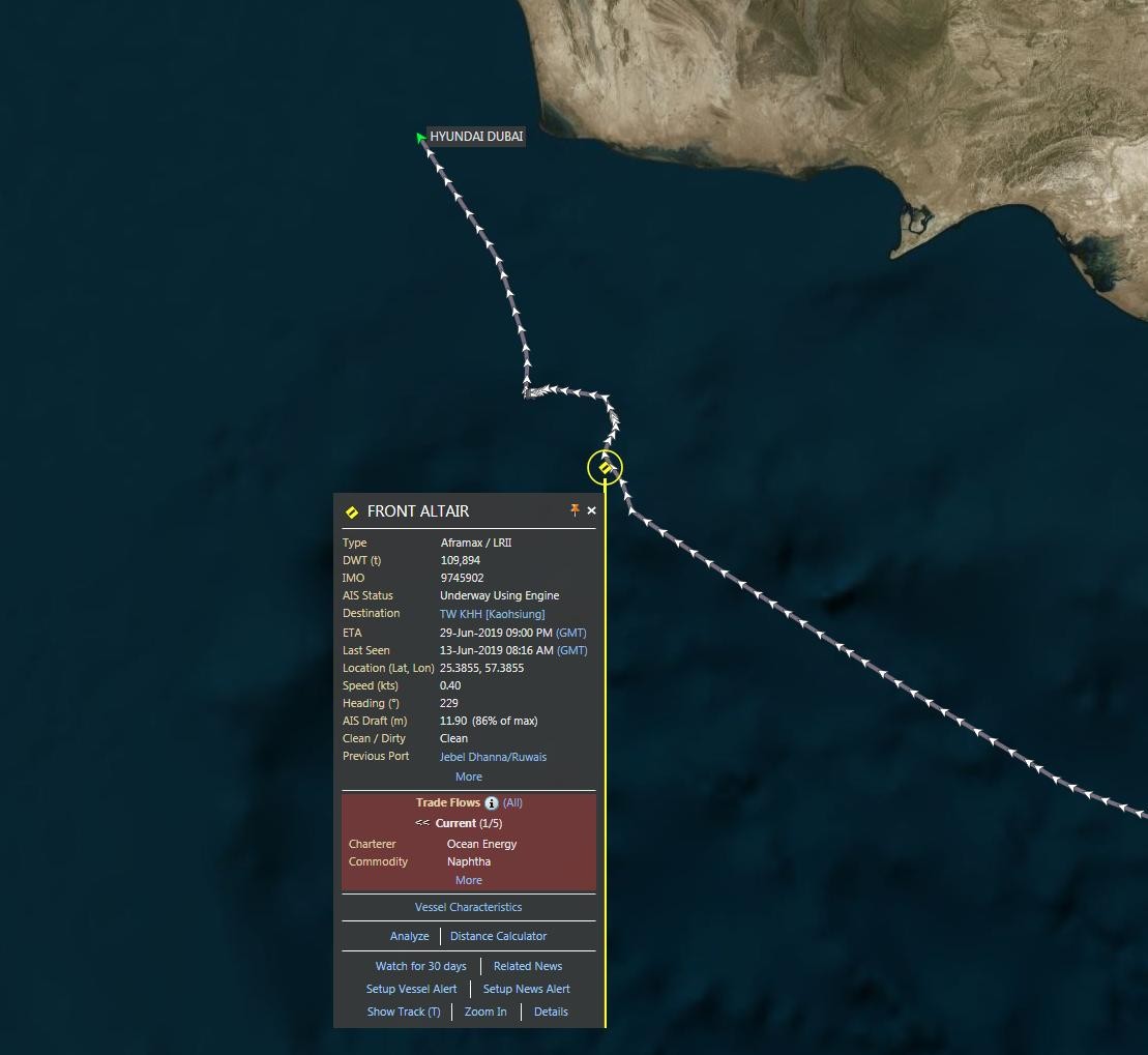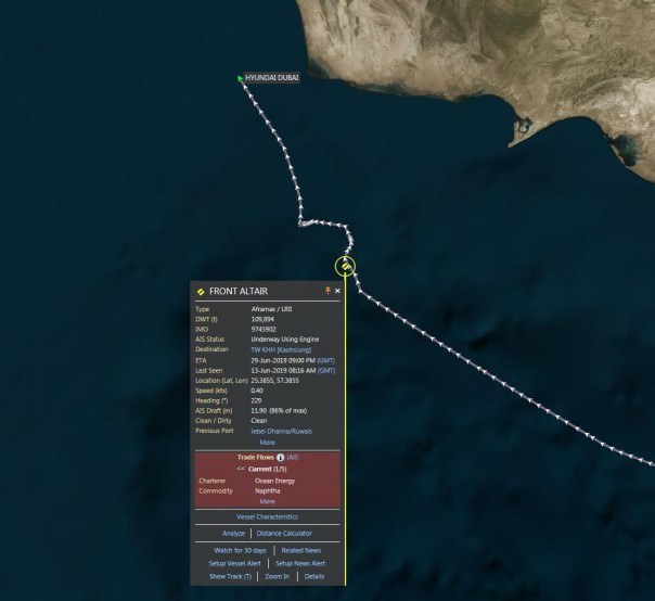 Тайваньская государственная энергетическая компания CPC заявила, что в зафрахтованный фирмой Front Altair, который доставлял топливо с Ближнего Востока, "предположительно, попала торпеда". Там также рассказали, что танкер перевозил 75 тысяч тонн лигроина — горючей смеси жидких углеводородов.