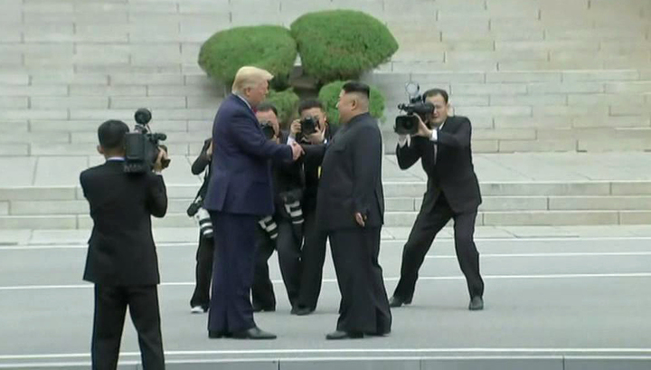 Американский президент Дональд Трамп встретился с лидером КНДР Ким Чен Ыном. Встреча двух лидеров состоялась в демилитаризованной зоне между двумя Кореями в пункте переговоров Пханмунджом, передает телеканал "Россия 24". Лидеры США и КНДР впервые в истории пожали друг другу руки через военно-демаркационную линию.