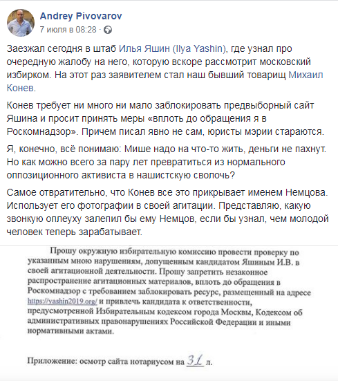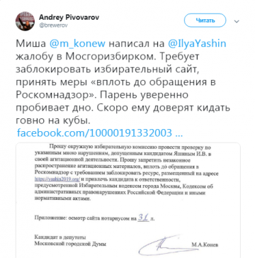 Стало известно о том, что кандидат в МГД Михаил Конев «донес» в Мосгоризбирков на своего оппонента Илью Яшина. Что, безусловно, вызвало негативную реакцию со стороны «друганов» оппозиционера. Таких, к примеру, как директор «Открытой России» Андрей Пивоваров, который тут же начал строчить гневные посты в социальных сетях о том, какой же Конев мудак.