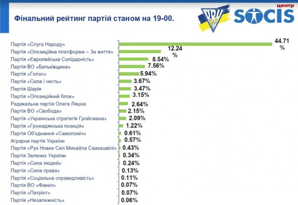 Экзитпол Социс. Слуга народа - 44,71%, Оппоплатформа - 12,24%