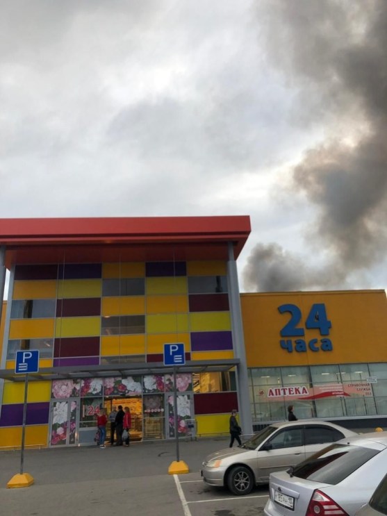 Как видно на камерах видеонаблюдения, сейчас пожар потушен, но у гипермаркета до сих пор множество пожарных и полицейских машин. Источник