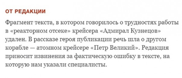 Фрагмент текста, в котором говорилось о трудностях работы в «реакторном отсеке» крейсера «Адмирал Кузнецов» удален. В рассказе героя публикации речь шла о другом корабле — атомном крейсере «Петр Великий». Редакция приносит извинения за фактическую ошибку в тексте, на которую нам указали специалисты».