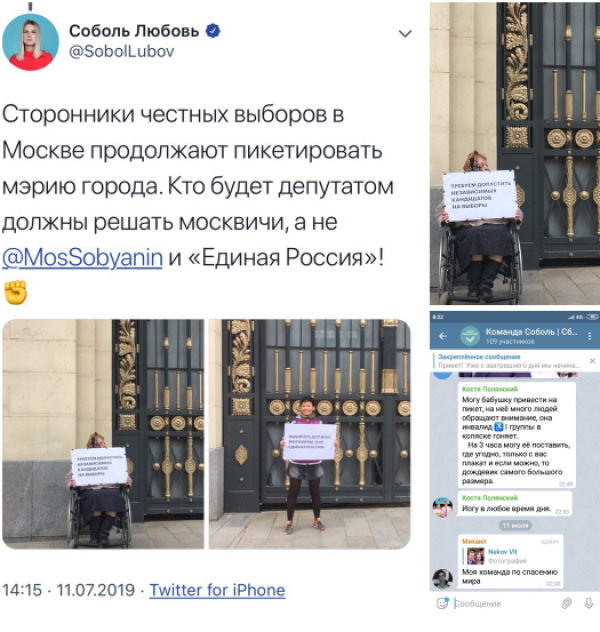 Красивый кадр одинокой пикетчицы в тот раз вызвал негодование – мало того, что пожилая женщина сидела абсолютно одна, да еще и несколько часов промерзлую погоду, так еще и всплыли скриншоты чата, где один из активистов попросту отдает старушку «в аренду». Мол, привезу, посажу – кадры будут зашибись.