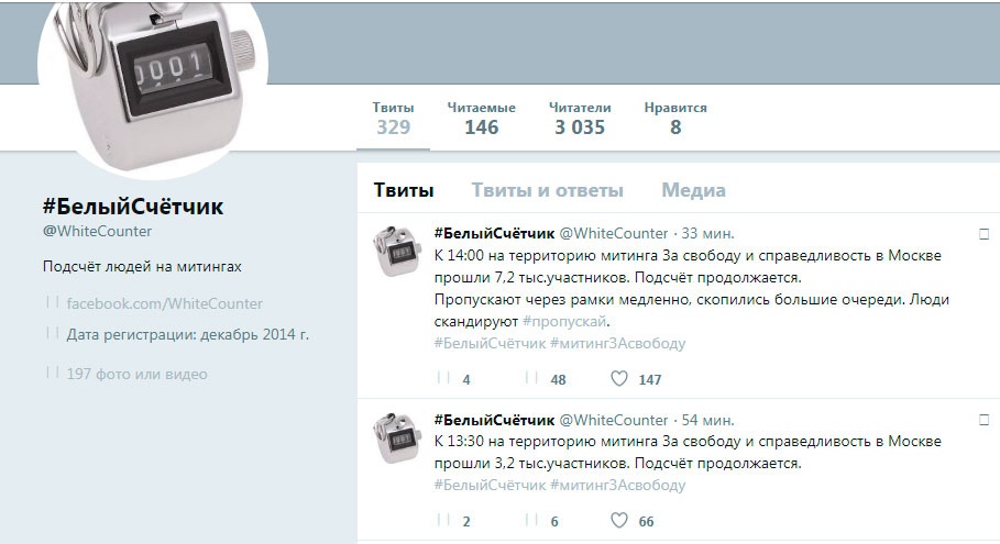 «Белый счетчик» явно куплен Путиным. Ибо даже на официальном сайте ГУ МВД России по г. Москве число участников вдвое выше: 15 тысяч. 15 тысяч лучших людей этой страны, не побоявшихся метеорологического оружия кровавого режима.
