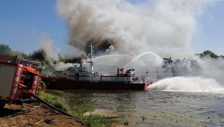 К месту уже прибыли несколько пожарных расчетов и пожарный катер. Источник