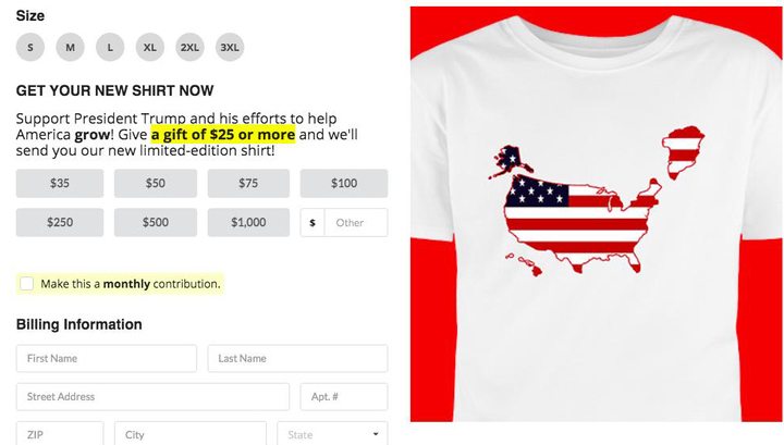 Отмечается, что тираж футболок ограничен. Они предлагаются в размерах от S до 3XL за пожертвование от $25 в пользу партии.