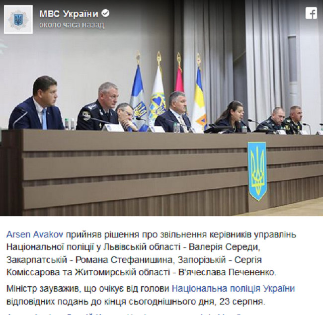 Сегодня, 23 августа, пока ещё министр МВД Арсен Аваков уволил ряд глав управлений Национальной полиции во Львовской, Закарпатской, Запорожской и Житомирской областях,. Также заявил о расторжении Министерством внутренних дел контракта с руководством казенного научно-производственного объединения «Форт» МВД, которое занимается разработкой и производством стрелкового оружия, боеприпасов и спецсредств, и уволил его директора.