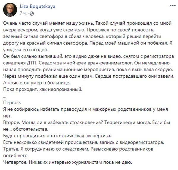 Примерно так же, как в октябре прошлого года, блогер и «активистка» Лиза Богуцкая сбила насмерть пешехода на перекрестке. Мало того – тогда она не только убила человека, но и имела наглость попросить у интернет-сообщества деньги на… адвоката. Мол, траты ей предстоят немалые... Источник
