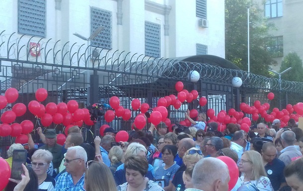 Под зданием посольства Российской Федерации в Киеве прошла акция, посвященная памяти украинских боевиков, погибших в «Иловайском котле» во время боев в Донбассе в 2014 году.