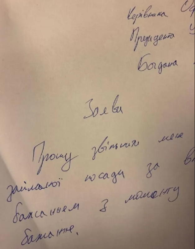 1 августа в СМИ со ссылкой на источники была опубликована копия заявления об увольнении с занимаемой должности руководителя Офиса президента Андрея Богдана.