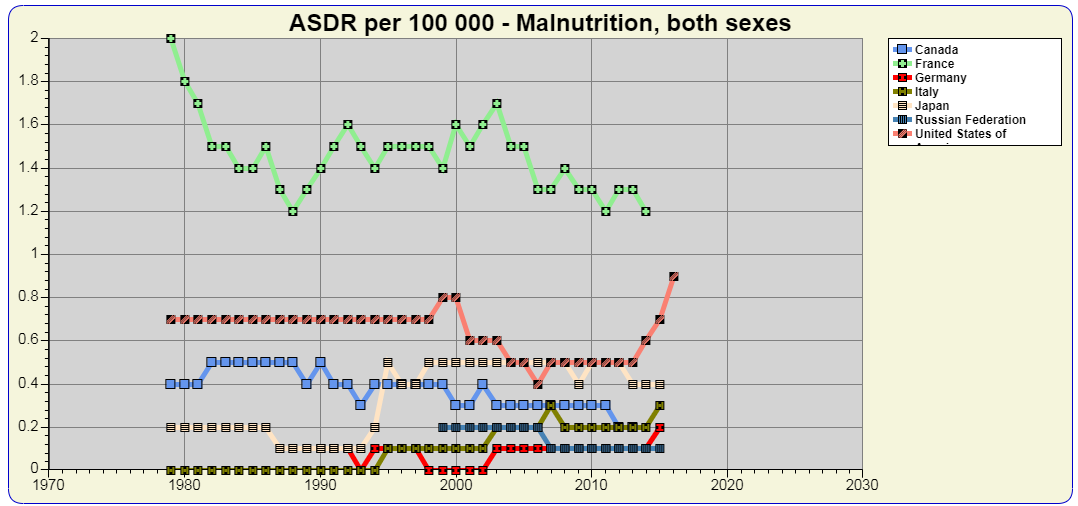 Берем показатель ASDR per 100 000 - Malnutrition, both sexes. (смерти от недоедания) Последний год в базе ВОЗ - 2015-2016. Подбираем страны G-8. (большой восьмерки) и смотрим результат. Самый низкий результат у России и Британии по 0,1. смертей на 100000 населения. Немного хуже Германия 0,2 . В Италии 0,3 , в Японии 0,4. Где то в 0,3 или 0,2 затерялась Канада. А вот в США от голода умирают в 9 раз чаще, чем в России. Во Франции, аж в 12 раз чаще.