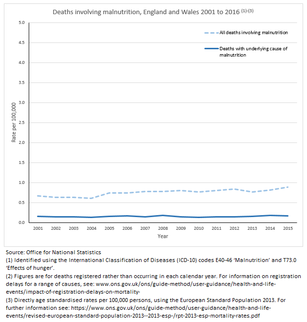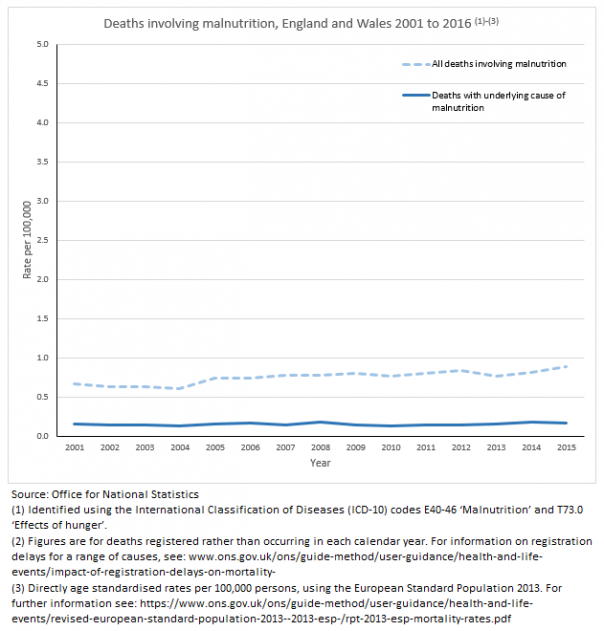 Стандартизованный по возрасту коэффициент смертности в Британии в 2001 году составлял 0,13 на 100 000 человек он вырос до 0,16 в 2016 году. Но если посмотреть на все случаи смерти, связанные с недоеданием, независимо от того, был ли голод основной причиной смерти или нет, стандартизированный по возрасту показатель составил 0,58 в 2001 году и вырос до 0,88 в 2016 году.