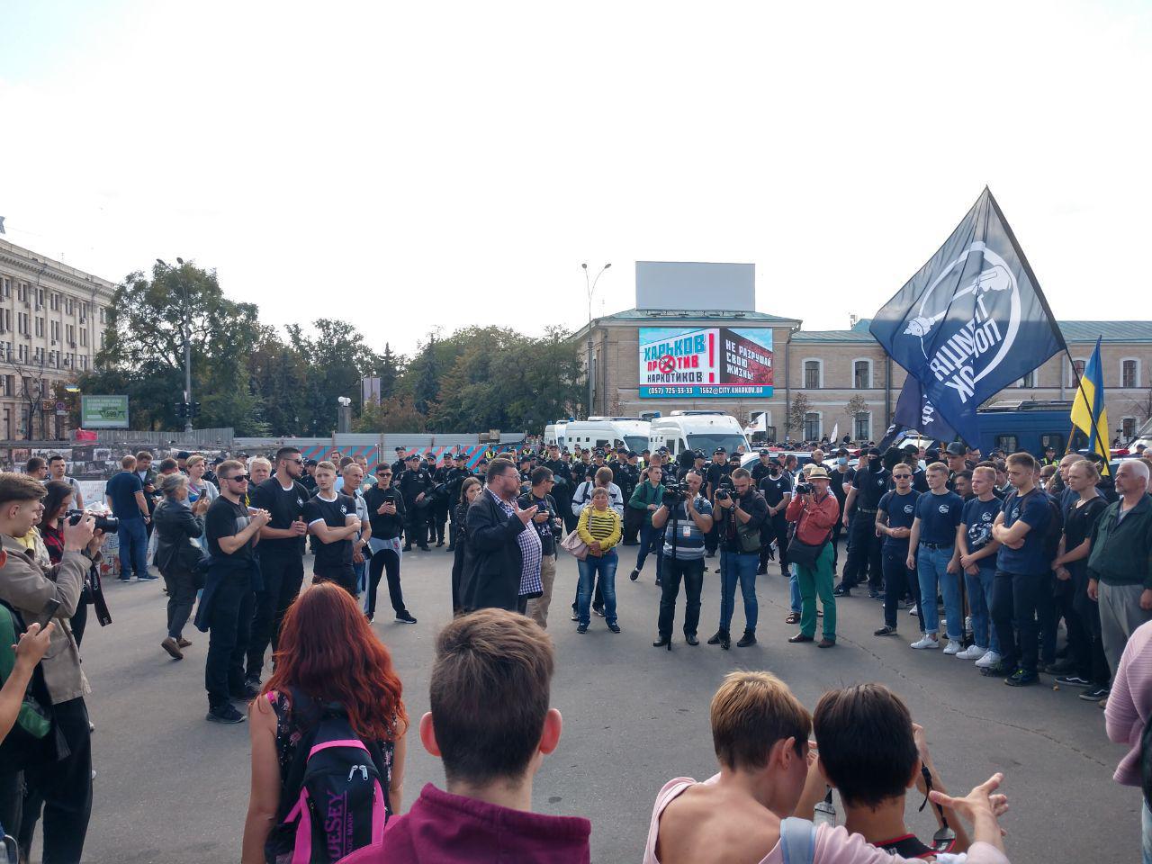 Перед началом марша, около 14:00, на оцепленную полицией площадь начали пускать людей. Наряду с участниками гей-парада туда прошли и его противники. Они развернули самодельные плакаты "Папа, мама, дети, дом! Украина не Содом!", "За традиционные семейные ценности" и другие.