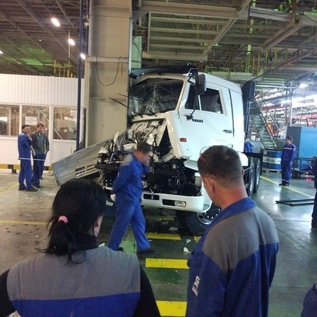 ДТП на заводе КамАЗ: грузовик съехал с конвейера и врезался в сваю