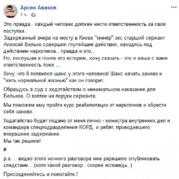 «Хочу, что б появился шанс у этого человека! Шанс начать заново и «жить нормальной жизнью» как он говорит. Обращусь в суд с ходотайством о минимальном наказании для Белько. О взятии на поруки сержанта. Мы поможем ему пройти курс реабилитации от наркотиков и обрести себя заново», — написал Аваков на своей странице в Facebook.