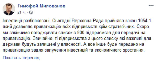 Как написал на своей странице в Facebook министр развития экономики, торговли и сельского хозяйства Тимофей Милованов, теперь появилась возможность согласовать список из 800 государственных предприятий, которые передадут на приватизацию.
