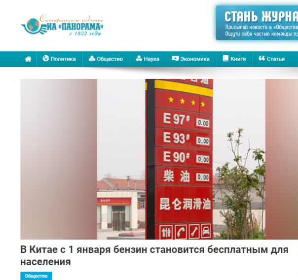 Большой экономист, руководитель Центра научной политической мысли и идеологии Степан Сулакшин, знающий как обустроить Россию, цитирует для своей паствы новогодний материал "Панорамы" о бесплатном бензине в Китае. Источник