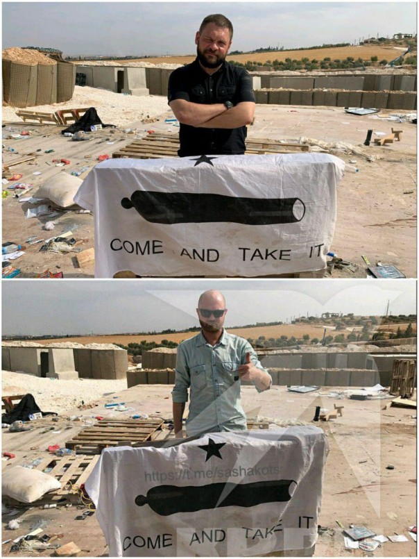 Военные корреспонденты из России Евгений Поддубный и Александр Коц нашли на американской базе Дадат к северу от Манбиджа брошенный флаг Центрального командования специальными операциями США с надписью «Come And Take It» («Приди и возьми»).