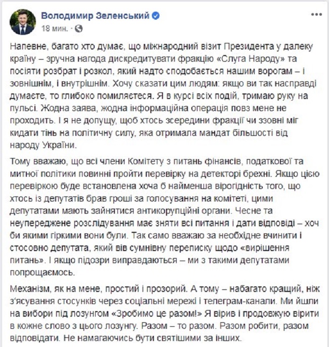 Президент Владимир Зеленский уже отреагировал на ситуацию, заявив, что депутаты должны пройти проверку на детекторе лжи, которая сможет подтвердить или опровергнуть выдвинутые против них обвинения.