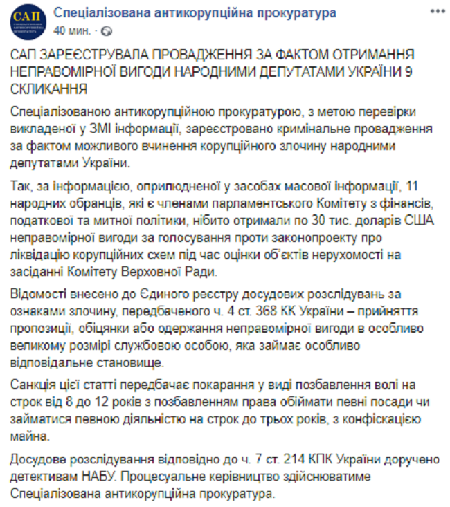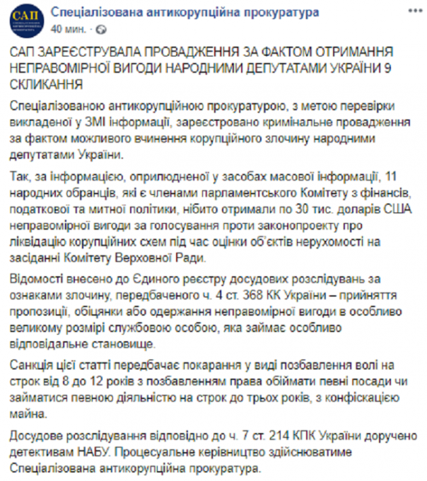Сведения внесены в Единый реестр досудебных расследований по признакам преступления, предусмотренного ч. 4 ст. 368 (принятие предложения, обещания или получения неправомерной выгоды в особо крупном размере служебным лицом, которое занимает особо ответственное положение) УК Украины.