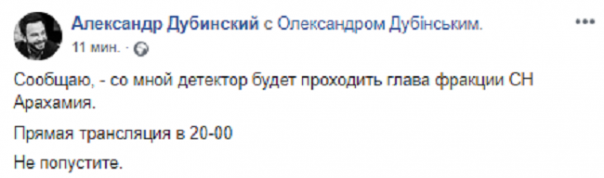 Народный депутат от «Слуги народа» Александр Дубинский уже заявил, что готов пройти проверку, причём сделает это в эфире онлайн–трансляции в 20:00 23 октября. Также он сообщил, что вместе с ним полиграф пройдет глава пропрезидентской фракции Давид Арахамия.