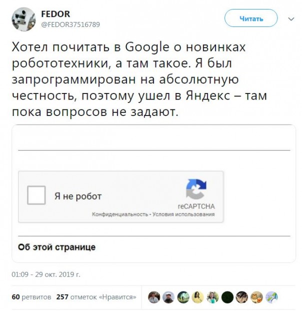 — Хотел почитать в Google о новинках робототехники, а там — такое. Я был запрограммирован на абсолютную честность, поэтому ушёл в "Яндекс" — там пока вопросов не задают, — написал "Фёдор" в "Твиттере".