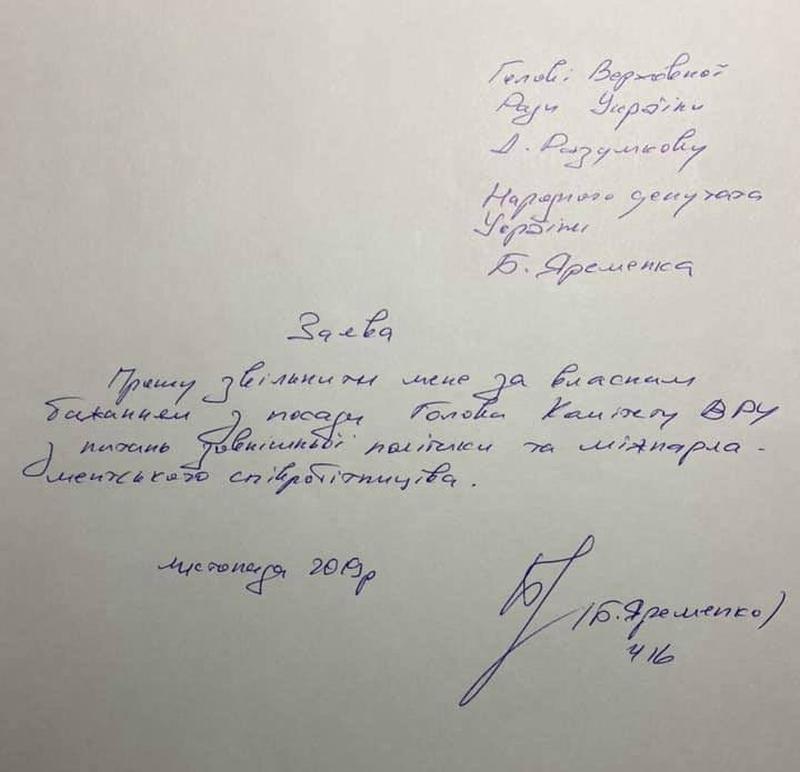 Глава комитета Верховной Рады Украины по вопросам внешней политики и межпарламентского сотрудничества Богдан Яременко написал заявление об увольнении с этой должности. Фото заявления Яременко, ставший фигурантом громкого секс-скандала, разместил в социальной сети.