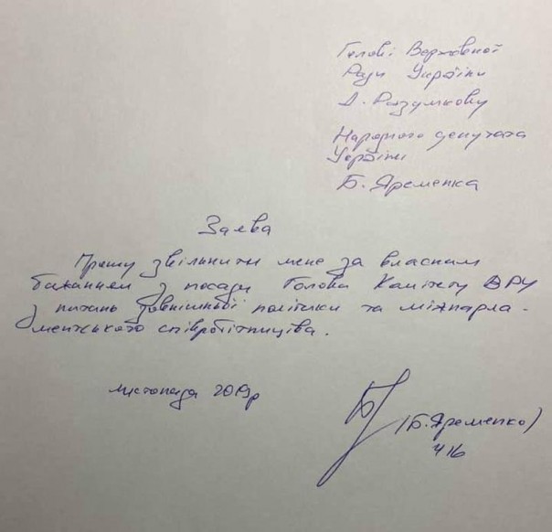 «С целью спасения украинского парламентаризма от меня, а украинской журналистики - в лице сайта «Буквы» от статьи 163 и 182 Уголовного кодекса Украины, и учитывая мелкий политический шантаж трех фракций парламента, я написал заявление о сложении полномочий председателя комитета», - написал Яременко.