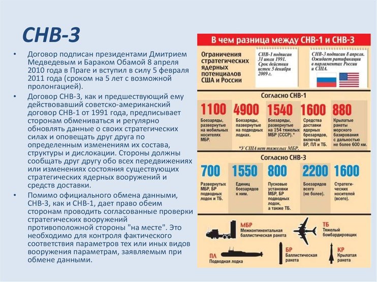 Договор о сокращении стратегических наступательных вооружений (СНВ-3), подписанный в 2010 г., остается единственным действующим договором между Россией и США об ограничении вооружений.