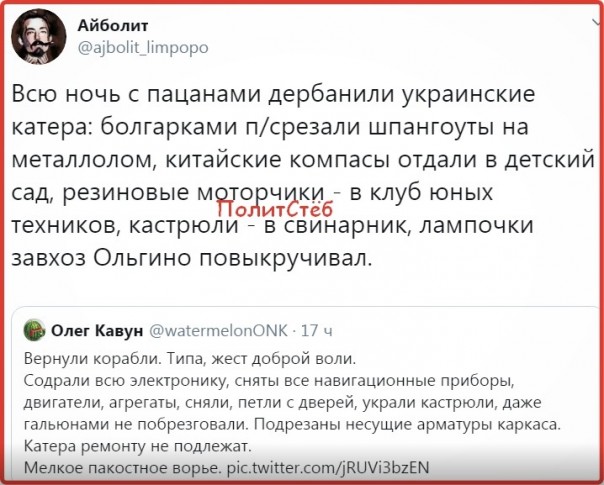 Напомним, ранее защищавший моряков ВМСУ московский адвокат Николай Полозов заявил, что переданные корабли были лишены навигационного и электронного оборудования перед возвратом их украинской стороне. Источник