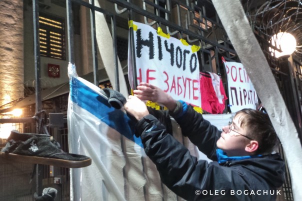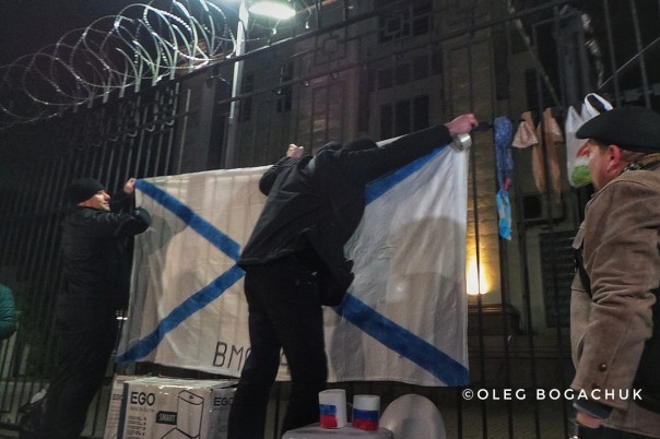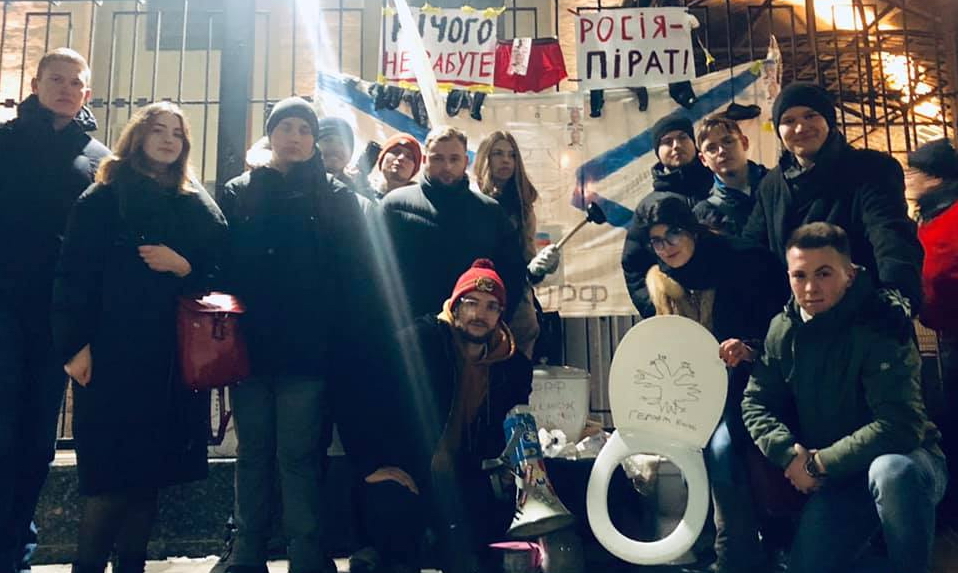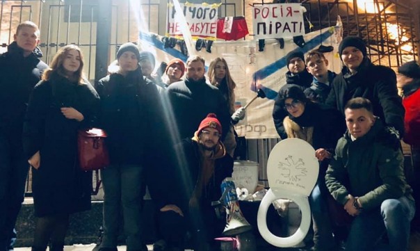 Организация «Украинские студенты за свободу» провела акцию возле посольства РФ в Киеве, посвященную годовщине сдачи в плен без боя экипажей катеров ВМСУ, участвовавших в провокации возле Керченского пролива.
