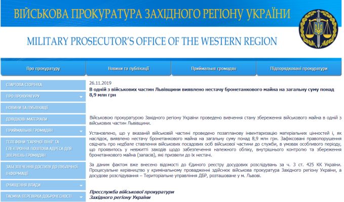 В одной из воинских частей Львовской области провели внеплановую инвентаризацию материальных ценностей и выявили недостачу бронетанкового имущества на общую сумму более 8,9 млн грн. Об этом сообщает пресс-служба военной прокуратуры Западного региона
