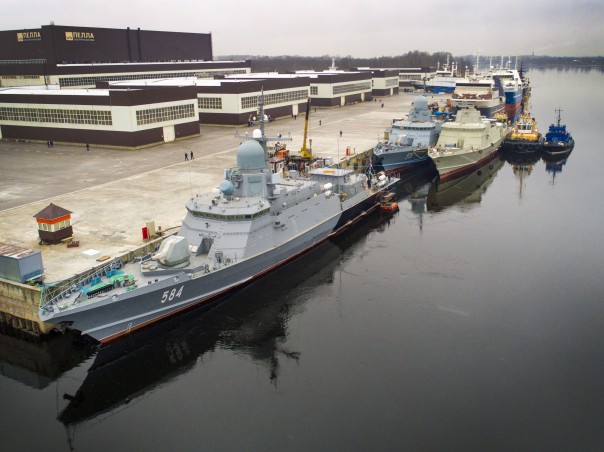 Строящиеся для ВМФ России малые ракетные корабли проекта 22800 у стенки ОАО "Ленинградский судостроительный завод "Пелла". На переднем плане готовящийся к выходу на заводские ходовые испытания малый ракетный корабль «Одинцово» (закладывался как «Шквал», заводской номер 253), на заднем плане МРК «Буря» (заводской номер 257), побортно с которым ошвартован прибуксированный из Феодосии на достройку МРК «Козельск» (закладывался под названием «Шторм», заводской номер 254) Отрадное (Ленинградская область), 28.11.2019 (с) Министерство обороны России Источник
