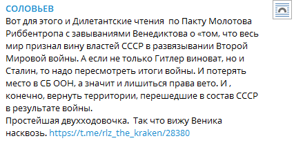 Тележурналист Владимир Соловьев, рассуждая о претензиях Польши на территории своих соседних стран, в том числе и к России, резюмировал, что планам Запада пересмотреть итоги ВОВ всячески способствует главред «Эха Москвы» Алексей Венедиктов. При этом Соловьев упомянул о Дилетантских чтениях Венедиктова, посвященные пакту Молотова-Риббентропа.