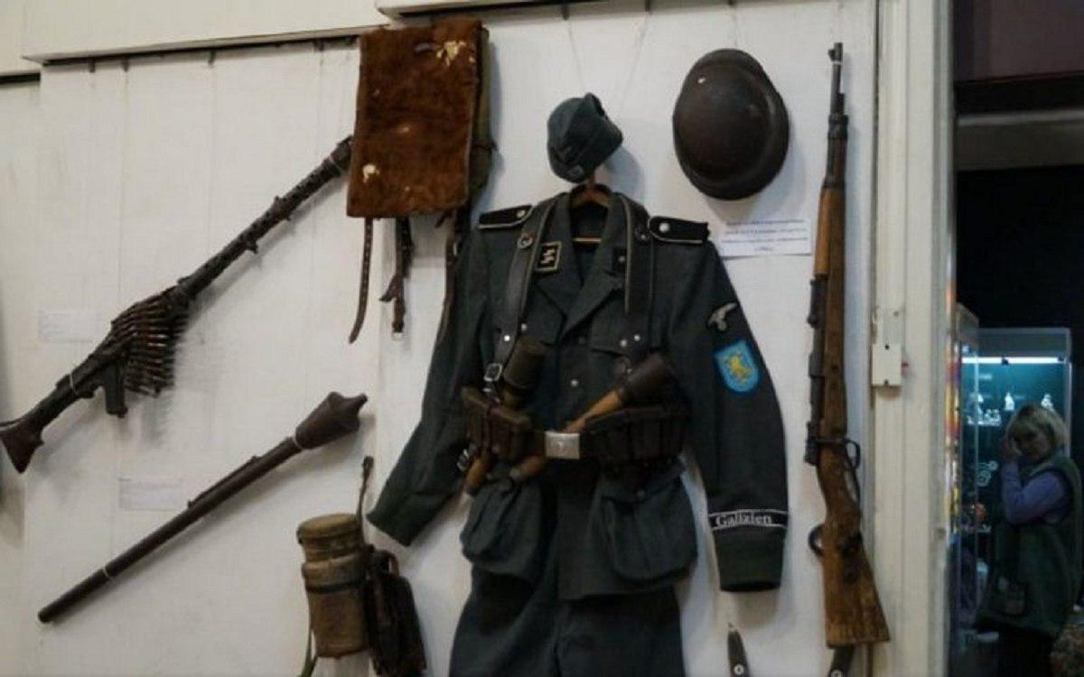 «Организаторы выставки считают, что Украину защищали и нацистские коллаборанты. На выставке демонстрируется военная форма и оружие служащих дивизии немецких Ваффен СС «Галиция». Добровольцы дивизии принимали присягу на верность Адольфу Гитлеру и нацистской Германии.
