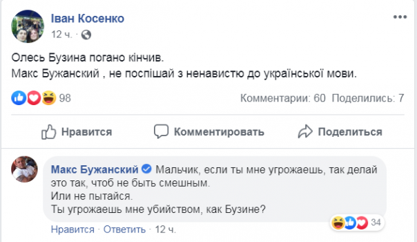 Косенко в этой связи обратился к Бужанскому с призывыом «не спешить с ненавистью к украинскому языку», добавив при этом, что «Олесь Бузина плохо закончил».