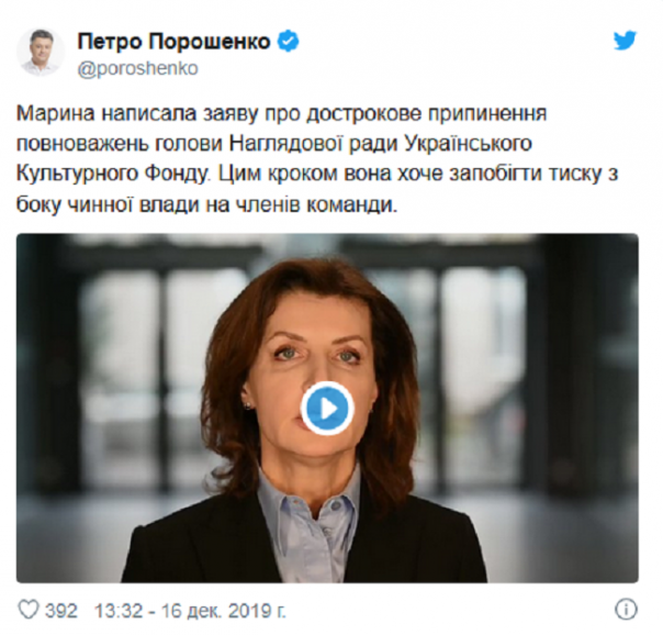 По словам Марины Порошено, несколько дней назад от министра культуры молодежи и спорта ей поступило предложение досрочно прекратить полномочия председателя Набсовета.
