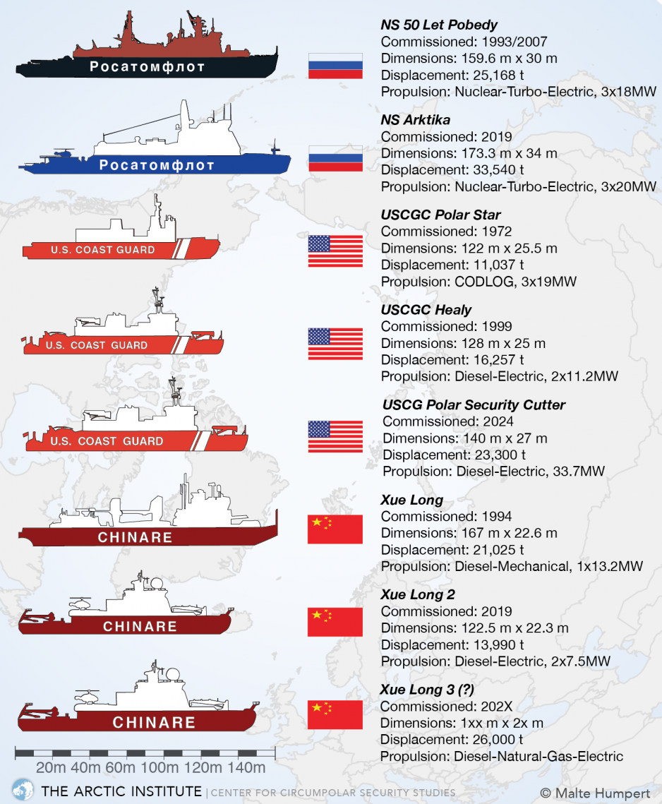 Китай является одной из нескольких стран, которые вкладывают значительные средства в модернизацию и расширение ледокольных мощностей. На этой неделе российская "Арктика", первая в серии по меньшей мере из пяти новых атомных ледоколов, начала ходовые испытания после шестилетнего строительства. В Соединенных Штатах береговая охрана приобретает три новых тяжелых ледокола, известных как USCG Polar Security Cutter, которые должны поступить на вооружение в течение следующего десятилетия. Строительство планируется начать на верфи VT Halter Marine в 2021 году, первый корабль должен быть поставлен заказчику в 2024 году. Источник