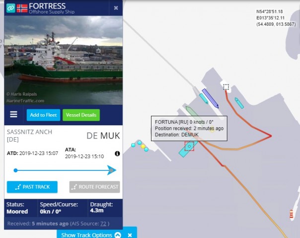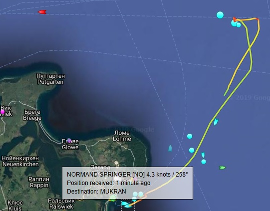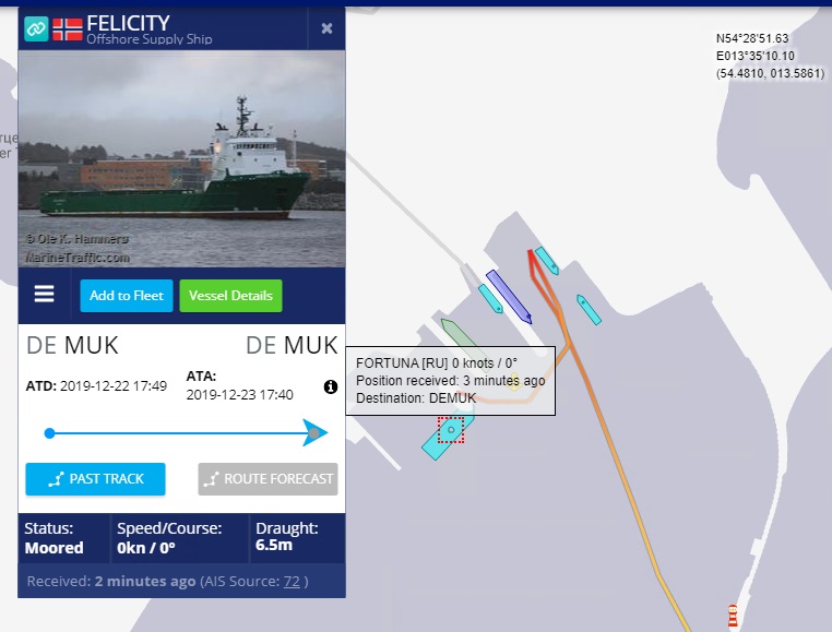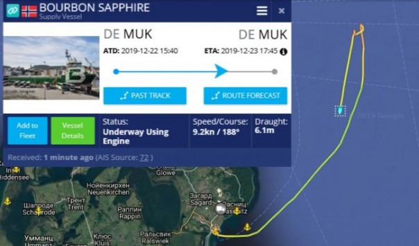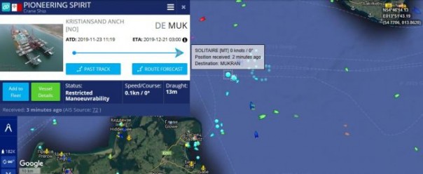 О выгрузке труб свидетельствует активное передвижение судов снабжения, которые участвуют в проекте, между трубоукладчиками и портом Мукран. Так, в 17.00 в порт после загрузки на трубоукладчиках Pioneering Spirit и Solitaire входили Fortress и Normand Springer, а Bourbon Sapphire находился на полпути. Ранее в Мукран прибыли суда снабжения Solvik Supplier и Felicity. У крупнейшего в мире трубоукладчика тем временем находились еще два судна — Bourbon Topaz и Alegria.