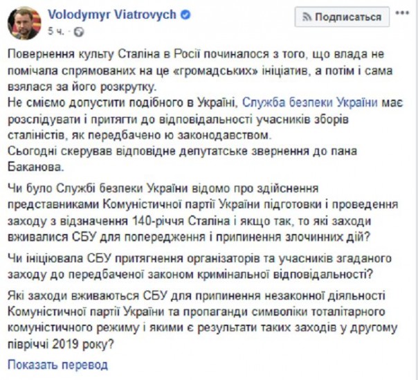 «Возвращение культа Сталина в России начиналось с того, что власть не замечала направленных на это "общественных" инициатив, а затем и сама взялась за его раскрутку. Не смеем допустить подобного в Украине, Служба безопасности Украины должна расследовать и привлечь к ответственности участников собрания сталинистов, как и предусмотрено законодательством. Сегодня направил соответствующее депутатское обращение к господину Баканову», — отметил Вятрович.