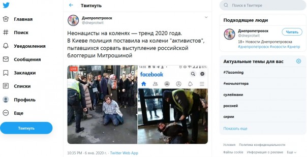 "Впоследствии приехала полиция, которая незаконно задержала активистов, надела на них наручники. Леонид Овчаренко был вынужден стоять на коленях перед озверелой толпой фанатов рашаблогершы, при задержании его избили", - плачутся националисты в соцсетях.