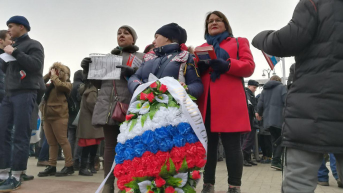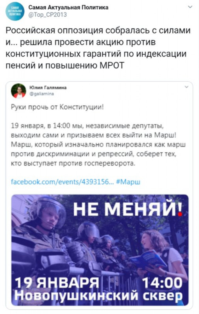 Недалёкая экзальтированная яблочница Галямина: "Руки прочь от Конституции! Марш, который изначально планировался как марш против дискриминации и репрессий, собрал тех, кто выступает против госпереворота. Потому что предложенные изменения нашей Конституции — дискриминация всей страны и репрессия против всех нас. Под видом перемен нам подсовывают переворот. Это не перемены — это переворот. Россия без Путина! Нет диктатуре!".