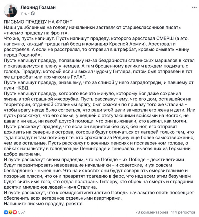"Мне очень хочется написать письмо на фронт. Своему прадеду. И рассказать ему о том, что сегодня, спустя 75 лет после Победы, до которой он так и не дожил, есть те, кто чуть ли не ежедневно своим грязным языком оскверняет всё то, за что он, без малейшей оговорки, отдал свою жизнь. И что потомки тех, кого мой прадед и ещё миллионы таких же, смогли уберечь от смерти, теперь будут плевать в их могилы, пытаясь нивелировать День, который всей большой страной приближали, как могли. Хочу написать о многом. Но не буду этого делать. Просто потому, что у меня есть много других слов, которые я должна сказать своему прадеду, в память о котором осталась единственная фотокарточка. И самое главное слово — это СПАСИБО. За всё, что они сделали тогда и благодаря чему мы смогли родиться и родить поколение уже пра-правнуков Победы. Которые, хочется верить, несмотря на все попытки воспитать их по новым методичкам, смогут уберечь нашу историю от переписывания и не оставят таким персонажам, как Гозман, ни единого шанса на успех", - пишет обозреватель NewsFront Юлия Витязева.