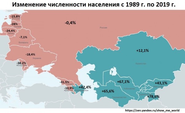 А вот на серьезные цифры увеличилось население в Таджикистане (+78,6%), Узбекистане (+67,1%), Туркменистане (+65,6%). На постсоветском пространстве сейчас проживает 296 миллионов человек (на 10 млн больше, чем в 1989 году). Источник