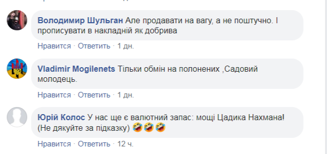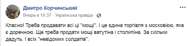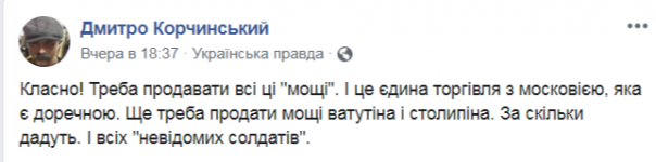 «Классно! Надо продавать все эти "мощи". И это единственная торговля с Московией, которая уместна. Еще надо продать мощи Ватутина и Столыпина. За сколько дадут. И всех "неизвестных солдат"», - написал он.