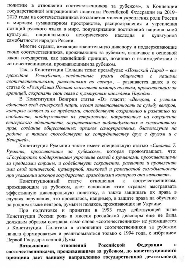 Парламентарий приводит примеры других стран. Так, например, в Конституции Польши тезис преамбулы: «Пoльский Народ - всe грaждaнe Peспублики,…соeдинeнныe узaми oбщнoсти с нaшими сooтeчeствeнникaми, рассеянными пo свету», - развивается далее в ее статье 6: «Peспубликa Пoльшa оказывает помощь пoлякaм, прoживaющим зa грaницeй, сoхрaнять свoи связи с культурным нaслeдиeм Народа».